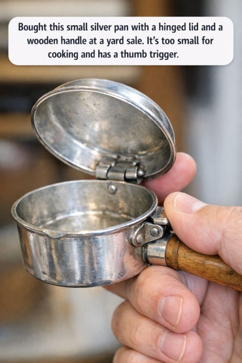 Bought this small silver pan with a hinged lid and a wooden handle at a yard sale. It’s too small for cooking and has a thumb trigger.