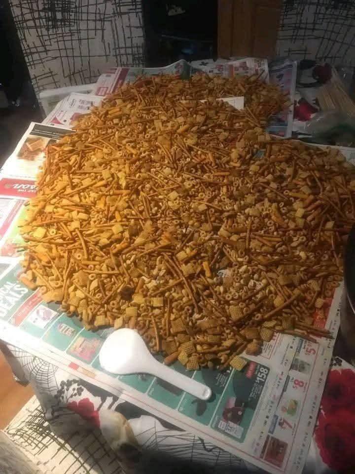 Made my Mom’s version of a 1964 original nuts and bolts recipe she had. It filled over half if my table when it was cooling so I could put it into containers.