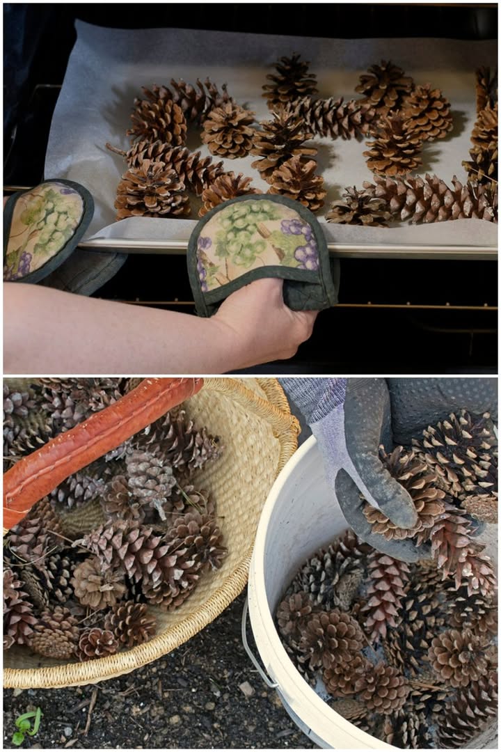 Let the cones cool completely before using them. Pine cones and pine resin are highly flammable. It’s very important to bake them at a low temperature and check them frequently.