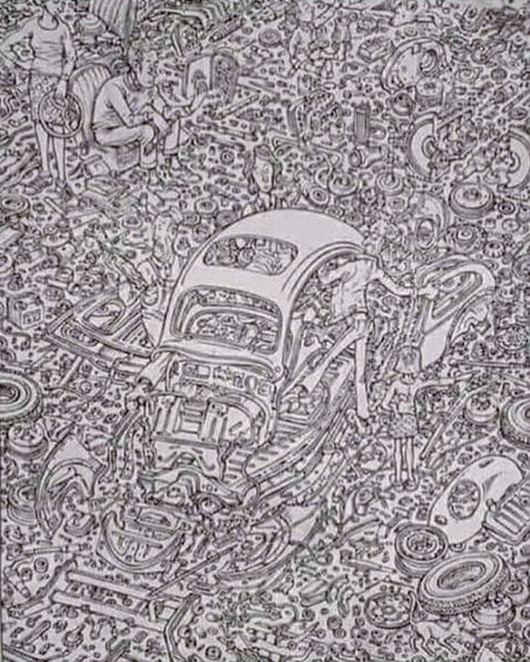 At first glance, this intricate design appears to be nothing more than a tangle of spare parts, tyres and mechanical elements. But on closer inspection, you’ll discover that six people and a cat are brilliantly hidden inside. All this in a car scrapyard setting, where every detail is important.