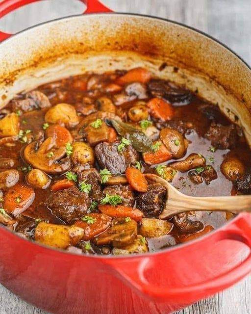 Add 4 cups beef broth, 2 bay leaves, 1/2 tsp dried thyme, 1 tsp salt, and 1/2 tsp pepper. Return beef and bacon to the pot then add potatoes. Stir to combine and make sure potatoes are submerged in liquid. Cover with lid and bake at 325˚F oven for 1 hour and 45 min.