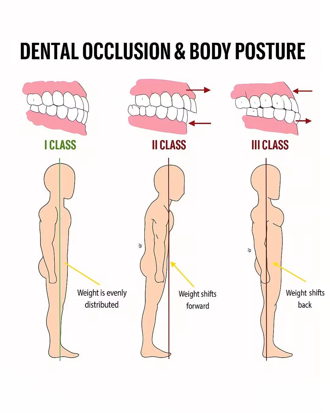 Below, we break down the three main classes of dental occlusion and how each one may affect the alignment and balance of your body.