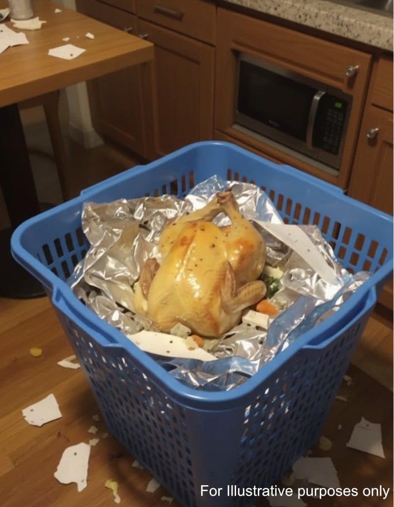 Cross-Contamination: The image depicts foil and scraps that could indicate cross-contamination. When raw turkey comes into contact with surfaces or utensils that have been contaminated with other foods, there is a heightened risk of spreading bacteria. Such conditions can lead to massive food poisoning incidents, affecting multiple guests and turning a joyous gathering into a nightmare.