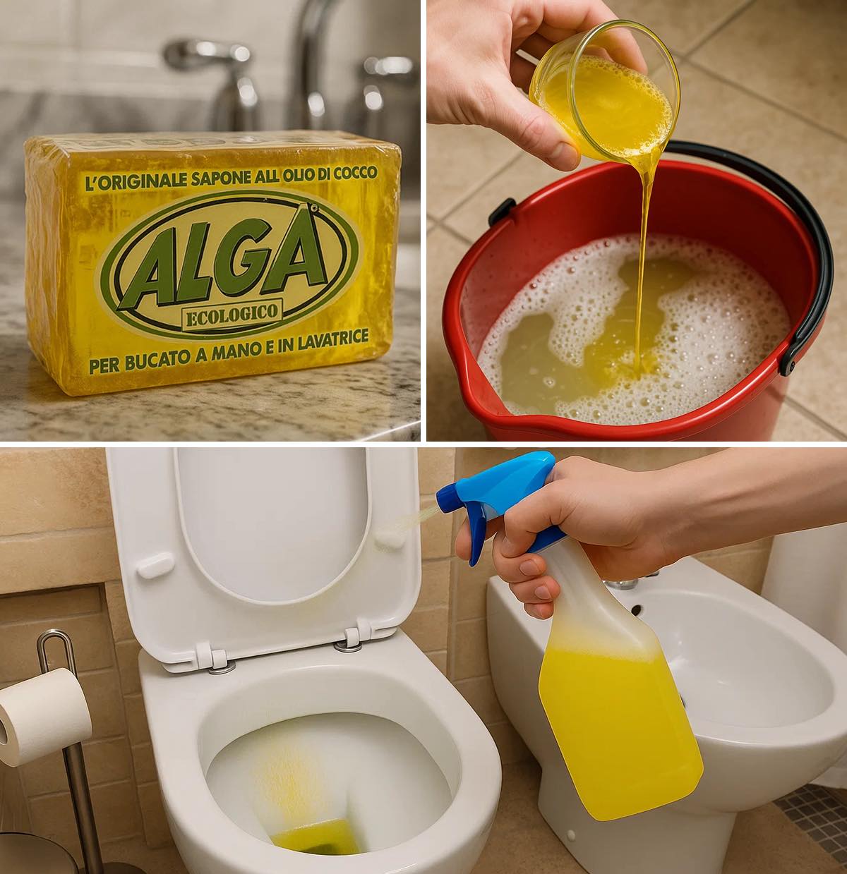 Yellow soap is made from coconut oil and can be found in supermarkets, almost always under the “Alga” brand. It costs very little and, as you will see, it is an extremely versatile and useful product for household chores.