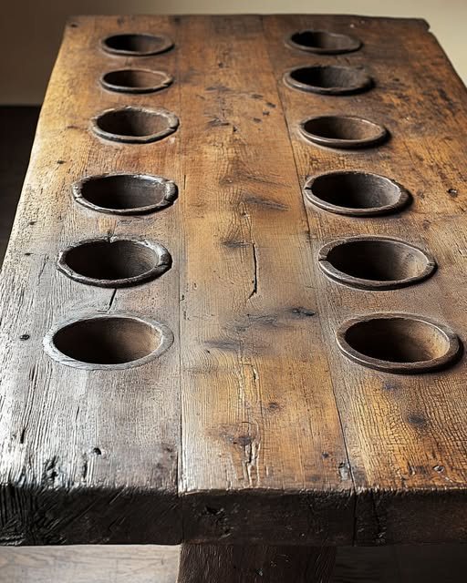 The table’s design is both functional and artistic, crafted from sturdy wood that has aged gracefully over the decades. Its most striking feature is the 12 built-in bowls, evenly spaced along the tabletop. These bowls are seamlessly integrated into the wood, suggesting a high level of craftsmanship and attention to detail. The table’s size and structure imply it was intended for communal use, possibly in a setting where large groups gathered regularly. The bowls could have been used for serving food or other communal activities, hinting at a specific cultural or social practice.