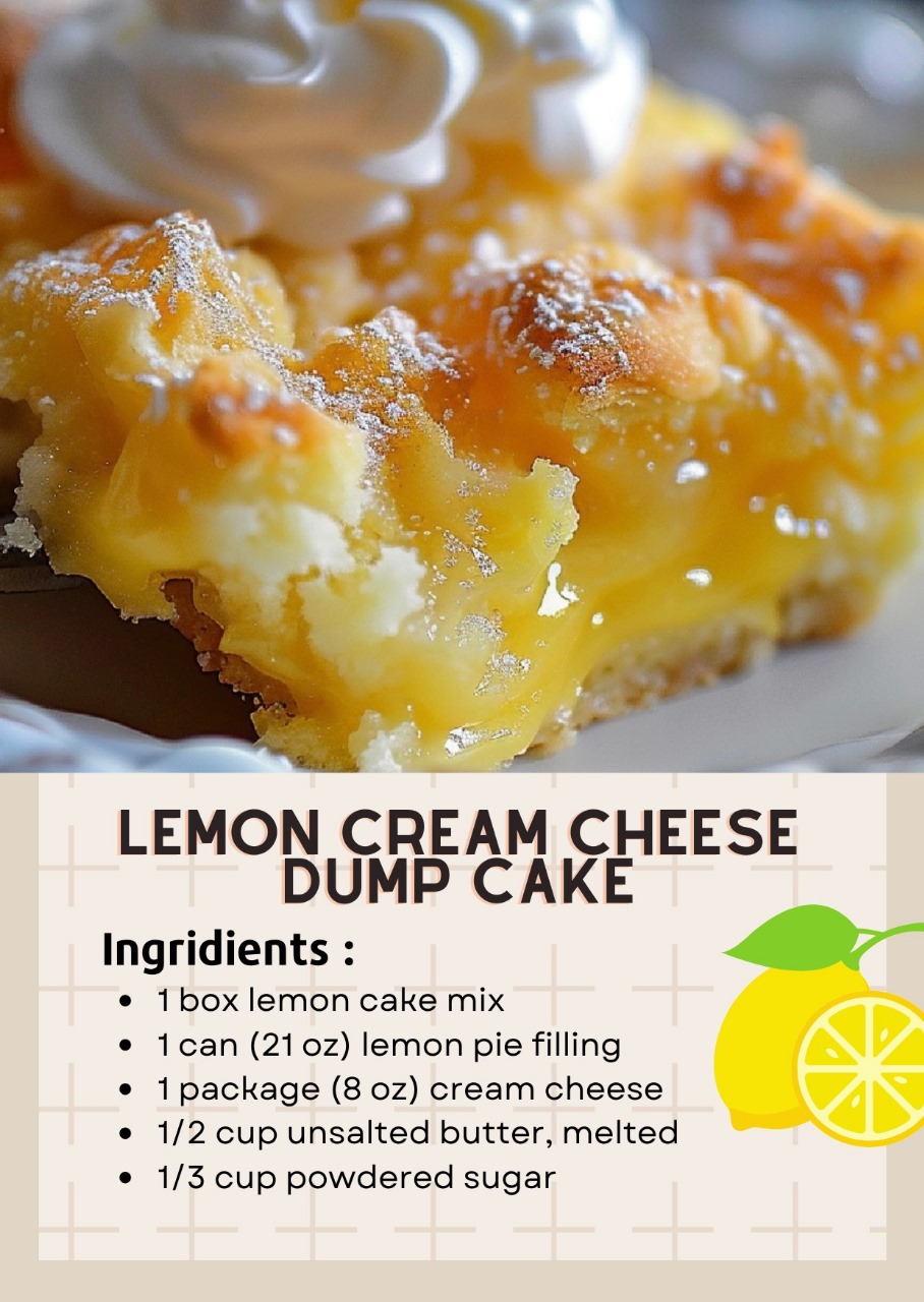 Preparation Time: 5 minutes Cooking Time: 1 hour Total Time: 1 hour and 5 minutes Course: Dessert Cuisine: American Keywords: Lemon, Cream Cheese, Dump Cake Servings: 12 Calories per Serving: 464 kcal Recipe