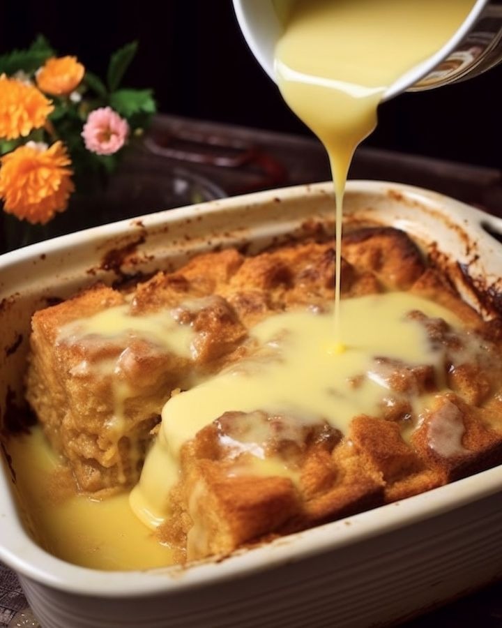 Delicious Bread Pudding with Vanilla Sauce in a Casserole Dish