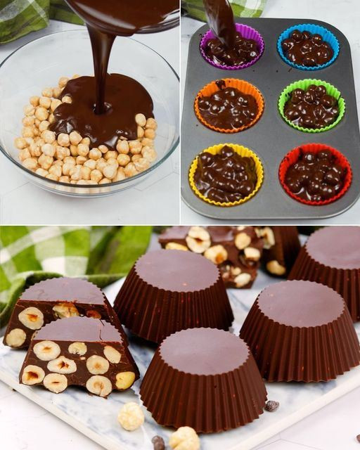 Silikon-Muffinformen mit Haselnuss-Schokoladen-Mischung füllen. Kühlen, bis es vollständig fest ist.