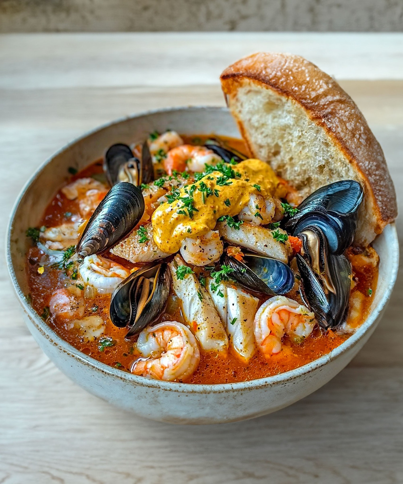 - In a blender, add the egg yolk, garlic, cayenne pepper, lemon juice, and bread soaked in fish broth.