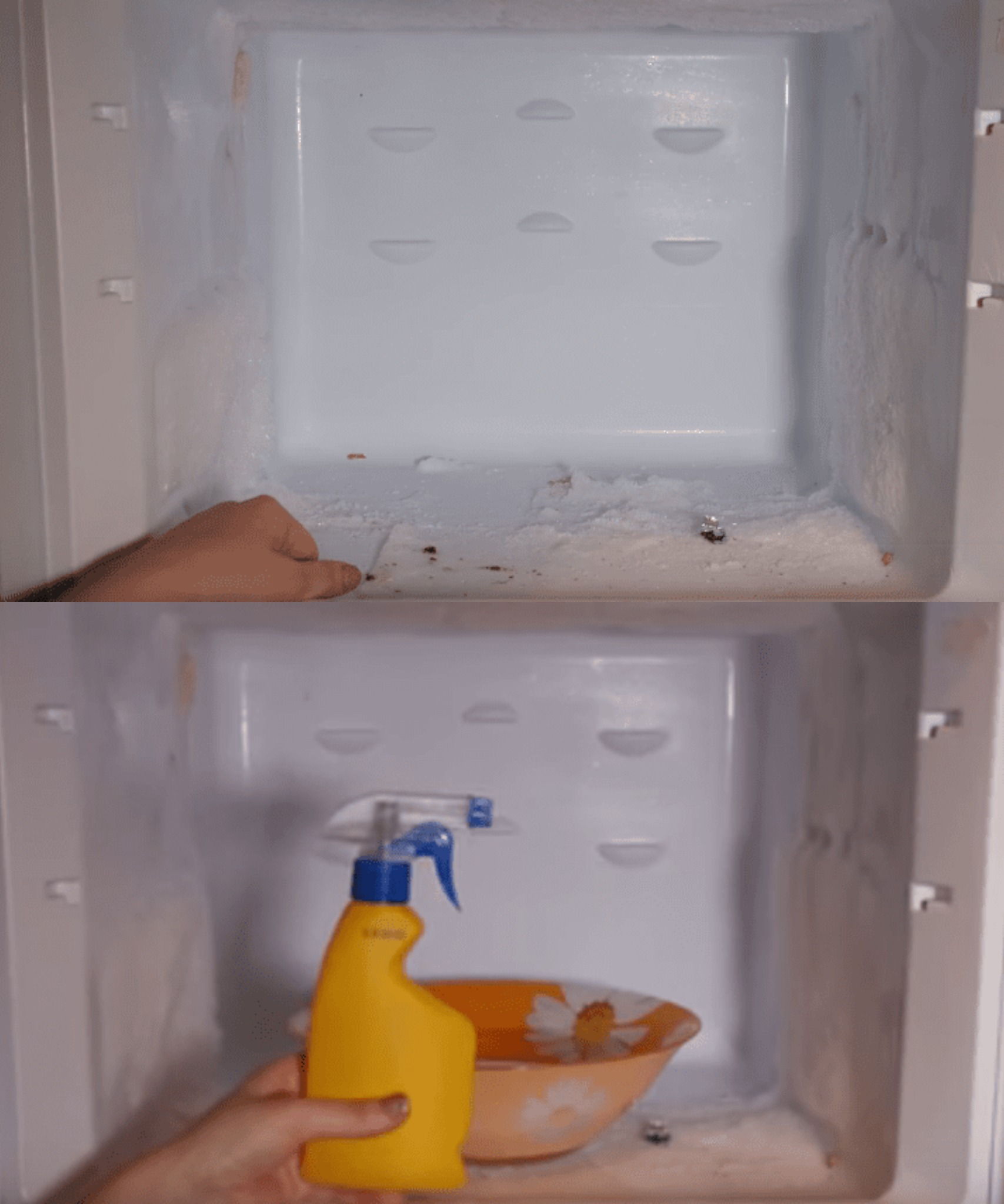 Pour the resulting saline solution into a spray bottle and gently spray it onto the freezer walls. A few minutes are enough for the ice to gradually begin to melt. You can lift it, for example, with wooden sushi sticks—this way you’re guaranteed not to damage the refrigerator surface.